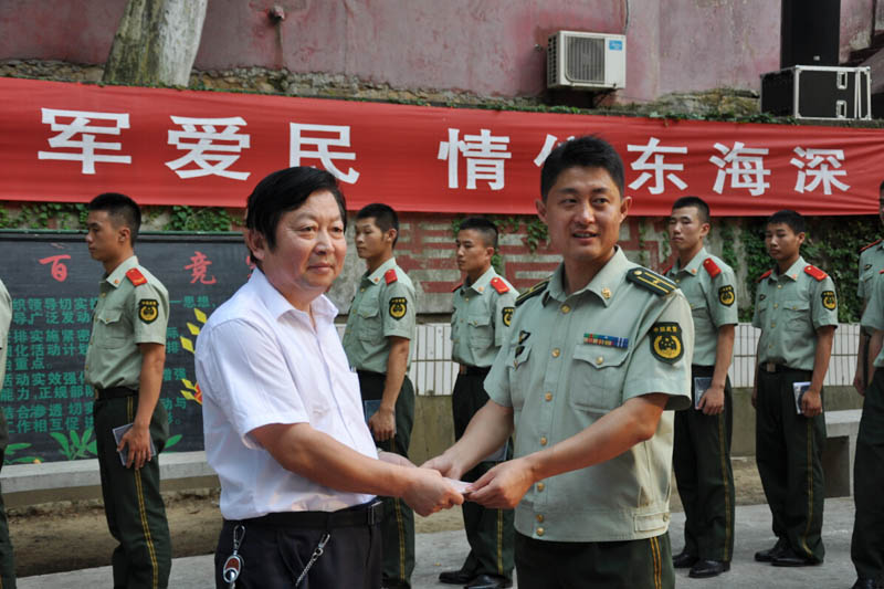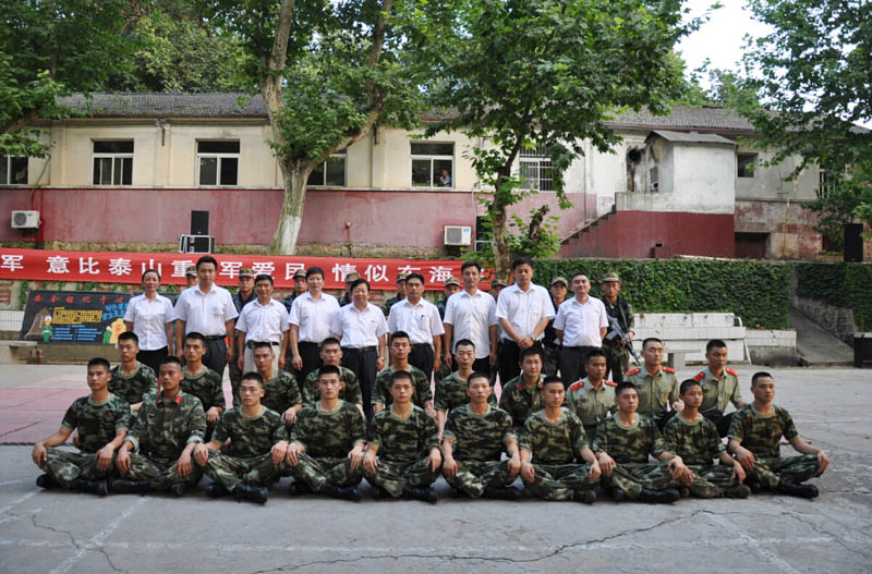 二〇一五年八月一日,公司董事长周德福同志组织全体党员来到南京市武警支队栖霞大队龙潭中队慰问全体武警官兵,并与官兵一起欢度八一建军节。图为慰问及活动现场。